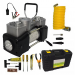Compresor auto 12V cu 2 cilindri si debit de aer de pana la 70L/min, conceput pentru umflarea rapida a anvelopelor si repararea rapida a penelor. Set complet cu accesorii pentru reparatii, adaptoare pentru obiecte gonflabile si valiza pentru transport.